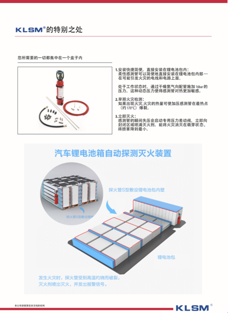徐州克林斯曼安防科技有限公司研制的动力锂离子电池Novec1230灭火装置,采用最新一代1230灭火剂为火灾抑制剂,连接锂电池火灾探测系统,在锂电池热失控初级近端进行火灾干预,将锂电池火灾控制在初起阶段。
