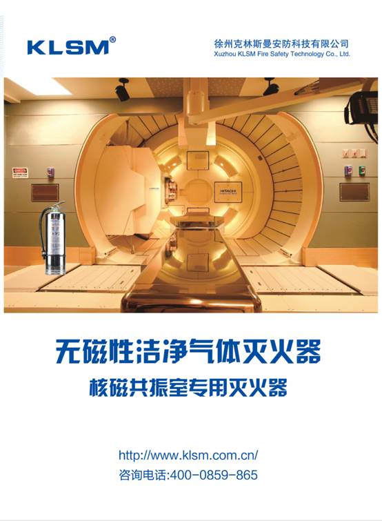 KLSM无磁性洁净气体灭火器专门用于核磁共振机房等强磁场场所,因为核磁共振设备是非常精密、昂贵的设备,不得使用有磁性普通的干粉灭火器、泡沫灭火器和二氧化碳灭火器,应使用不导电、无残留、低毒性、无磁性的专用灭火器。KLSM灭火器就是专门针对核磁共振机房等强磁场环境而研发的洁净气体灭火器,已广泛用于国内外大医院、科研机构,并取得国家3C强制认证证书和中国计量科学院磁性检验报告。